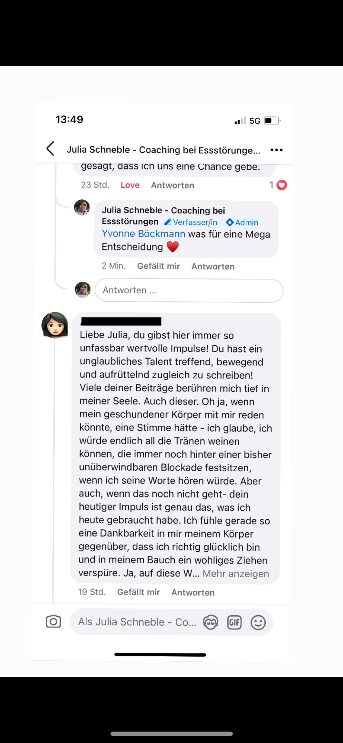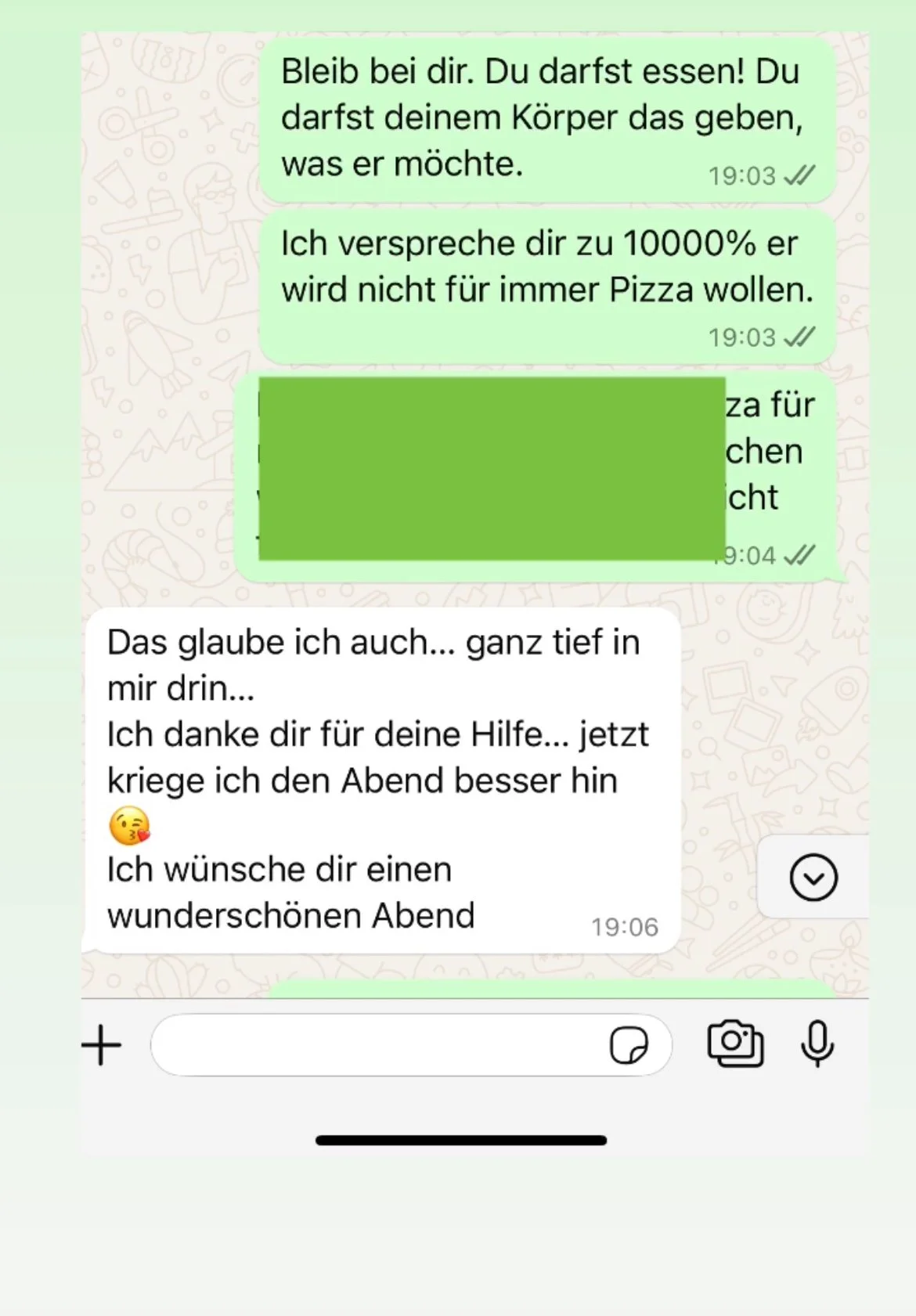 Bei einer Essstörung wird diese Achtsamkeit abtrainiert (manchmal jahrelang). Was auf der einen Seite hilft die Schmerzen zu ertragen, auf der anderen Seite aber die essgestörten Symptome verstärkt.